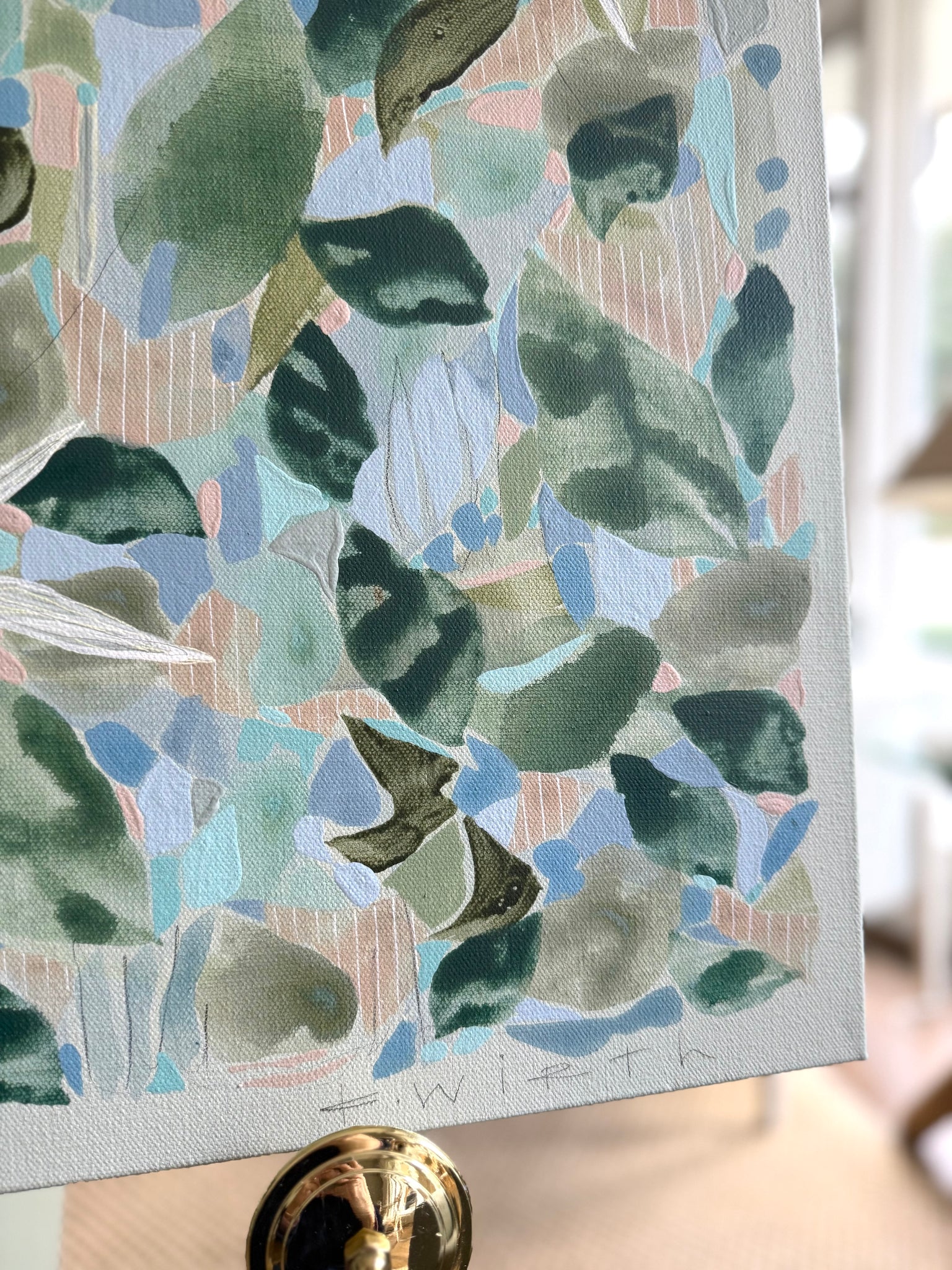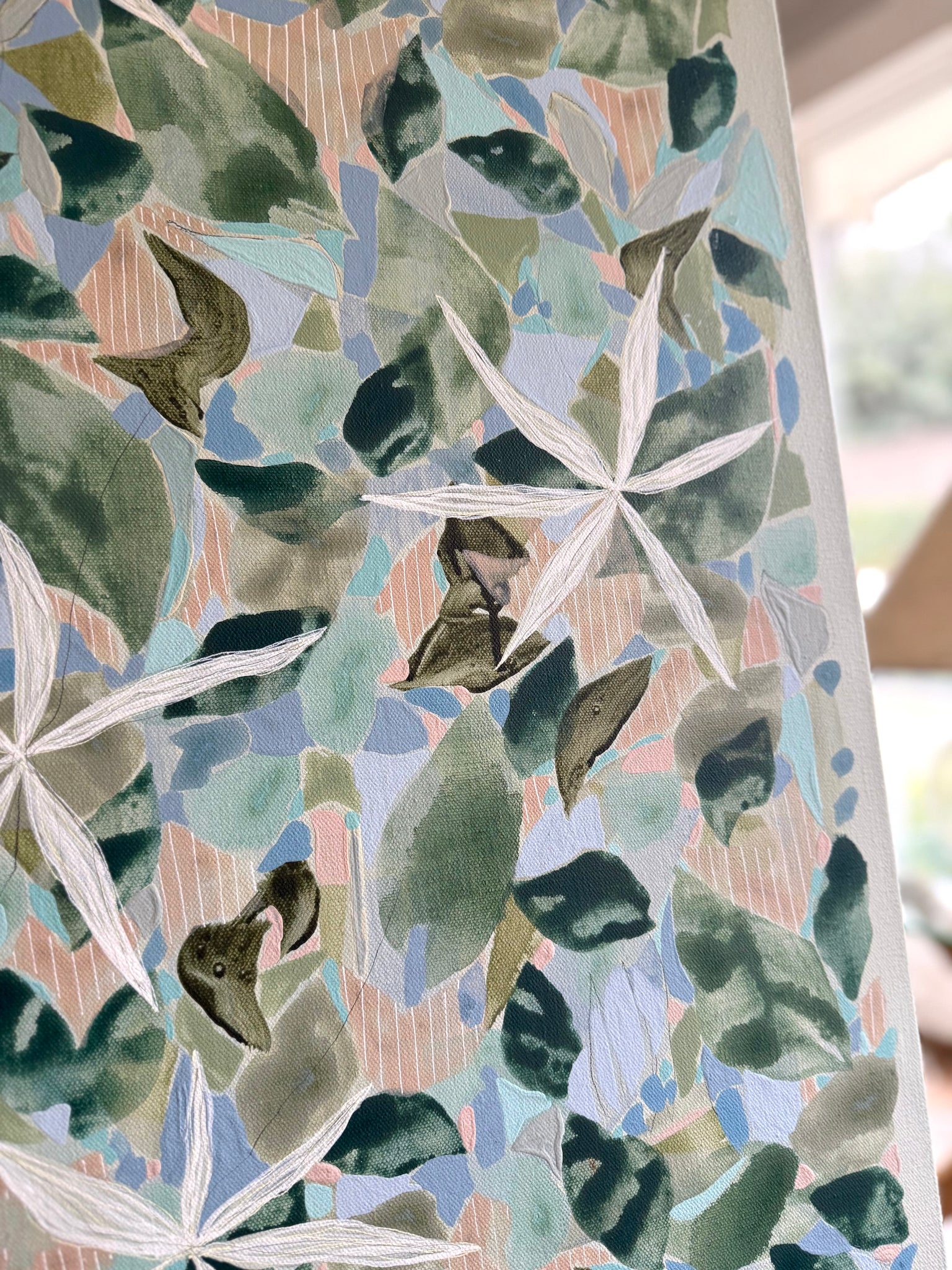 Acrylic, pencil and other mixed media on gallery-wrapped canvas. Unframed.