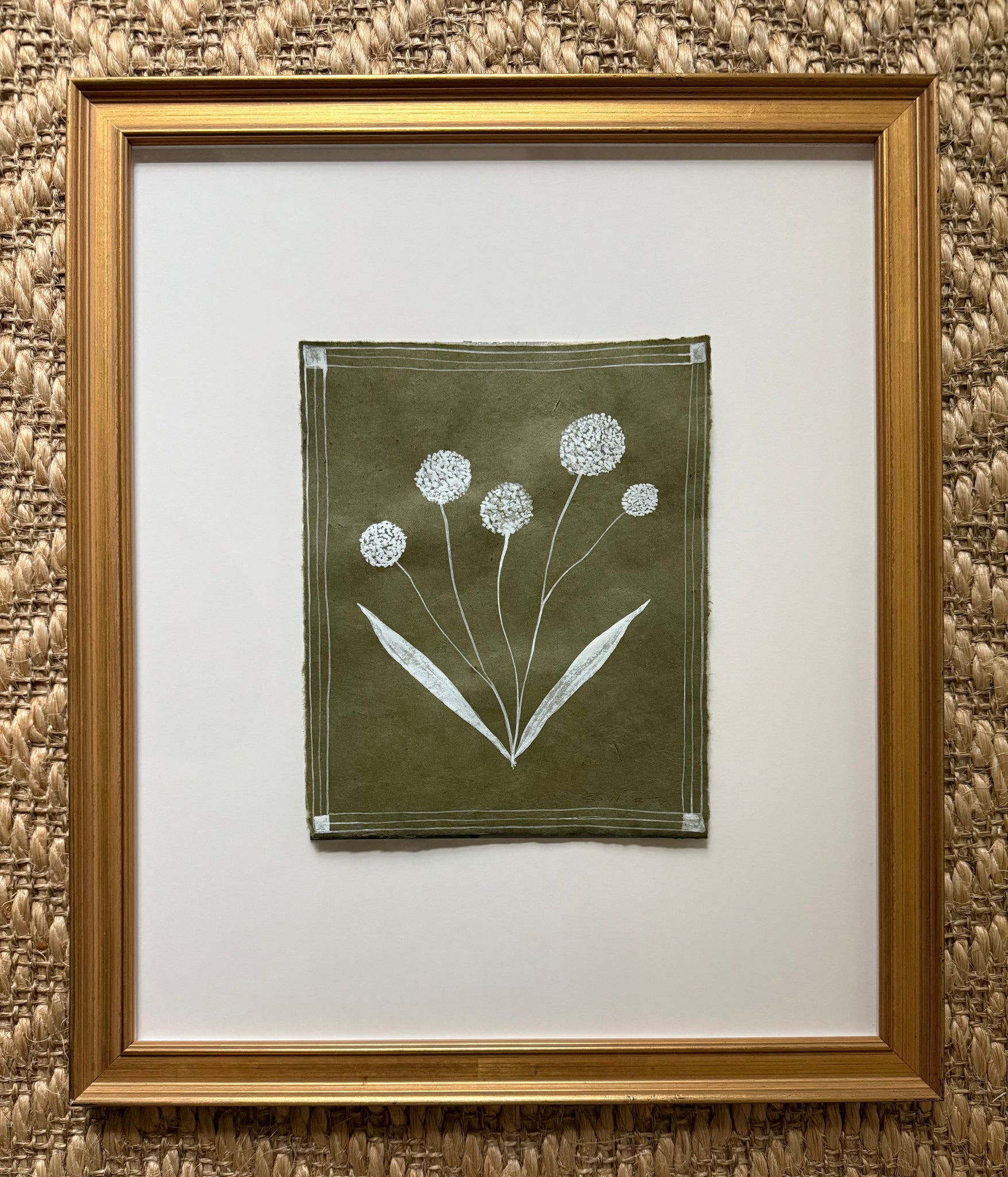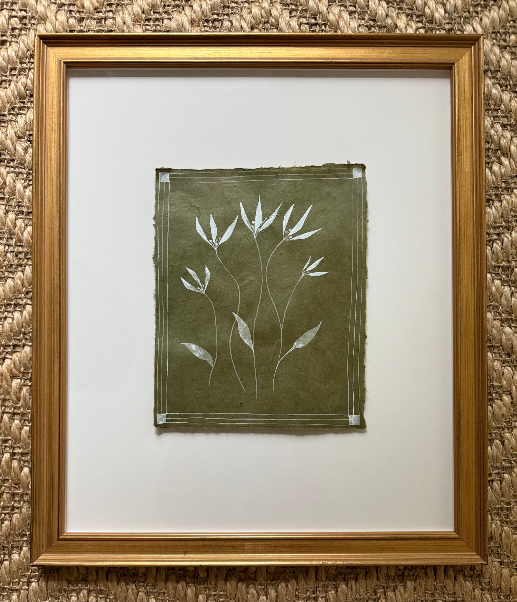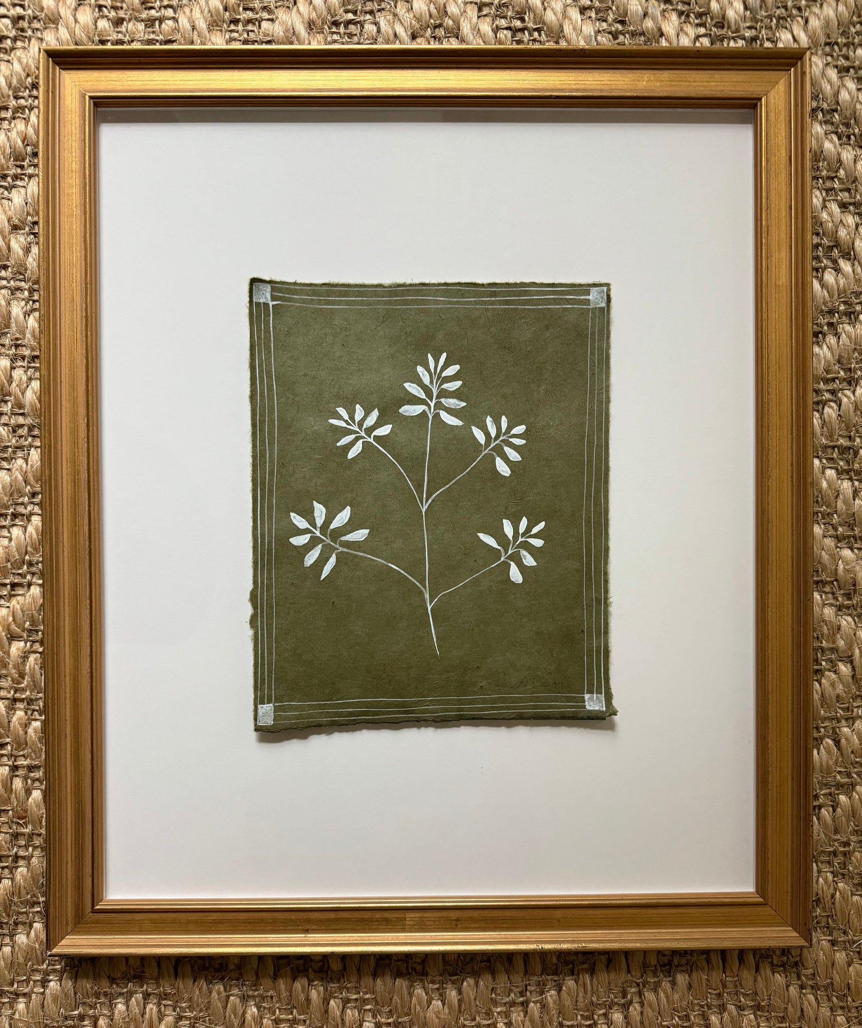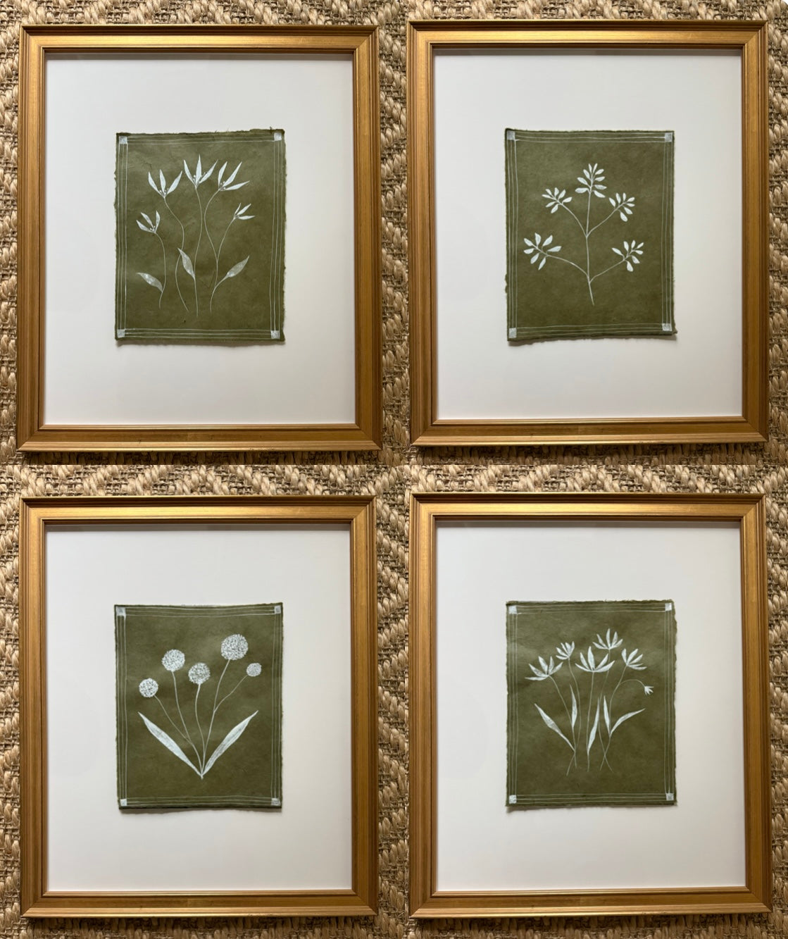 Acrylic on handmade olive paper with hand-torn edges. A set of 4. Unframed.